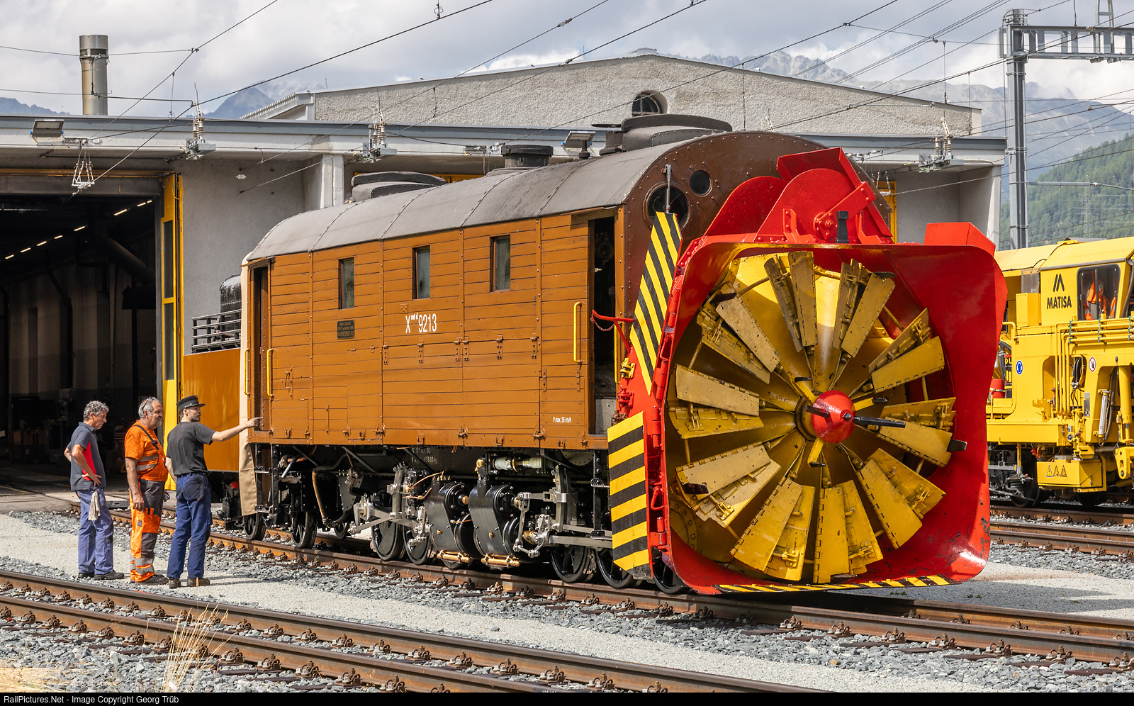The self-propelled 0-6-0+0-6-0 steam snow blower Xrot d # 9213 of the Rhaetian Railway, built in 1910 by SLM Winterthur for the then independent Bernina Railway, has been preserved as a historic vehicle. Until 2020, demonstration trips with the impressive machine were carried out in winter in the area of the Bernina Pass at around 2250 meters above sea level. Then a comprehensive overhaul was due. A single employee of the Rhaetian Railway refurbished the Xrot d # 9213 at the Pontresina depot and it is now complete. On the day before the ordered brake test and load runs, the vehicle stands under steam in front of the Pontresina depot. G.P., who carried out the overhaul, discusses the work with the engine driver and stoker.