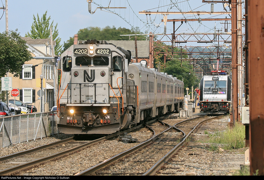After discharging passengers in Track #1, NJT 877 from Hoboken, NJ continues its journey west out of electrified territory and towards Hackettstown, NJ. On the hind end is NJTR 6026 (Comet V Cab Car). Next to it, NJT 6656 can be seen with NJTR 4617 (ALP46) on the rear loading passengers on Track #2 for its run to New York Penn Station. NJTR 4202 was built as a GP40 for the New York Central as NYC 3006. It then went to the Penn Central as PC 3006 and later to Conrail as CR 3006. It was rebuilt in the early 1990s to become GP40PH-2B NJTR 4202.