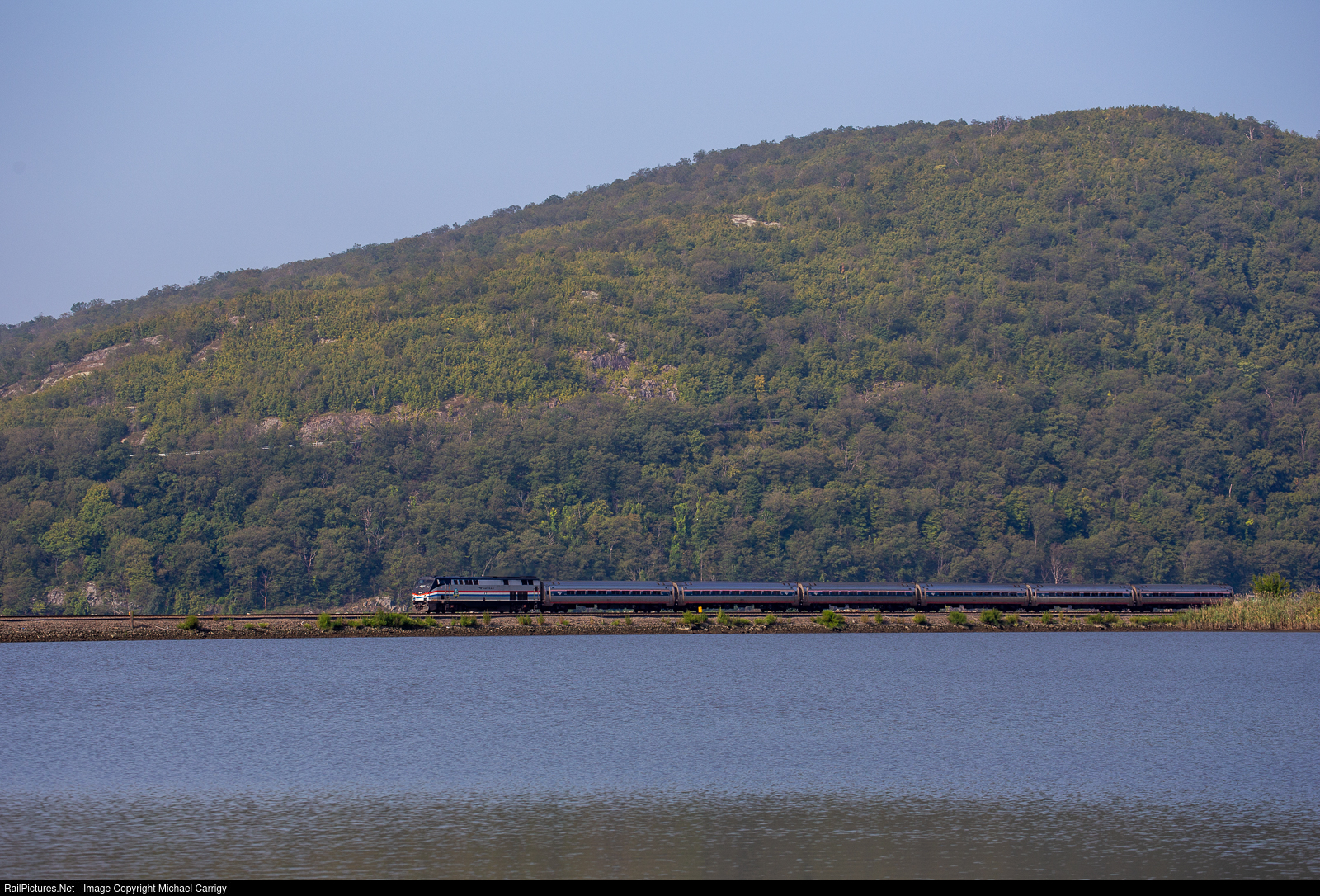 | Amtrak Engine 711 pulls a southbound train en route to New York Penn Station. This train chugs along with Bear Mountain in the background. |