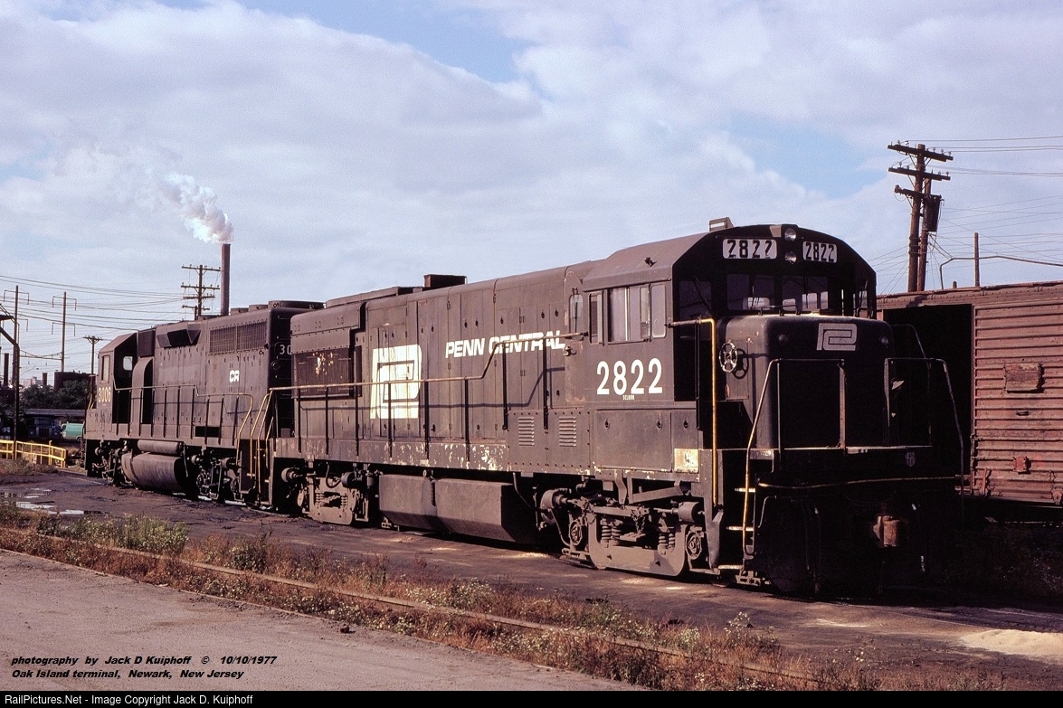 | PC, Penn Central 2822 U28B. One of two built for NYC. Oak Island engine terminal other unit CR, Conrail 3006 GP40, Newark, New Jersey. October 10, 1977. Jack D Kuiphoff © photo |