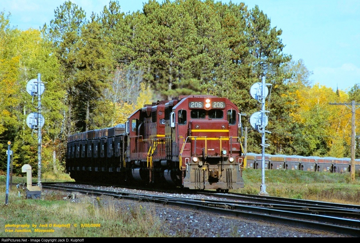 | DM&IR SD38AC 206 and SD38-2 211 with a loaded T-bird at Iron Junction, Minnesota. September 30, 2006. Jack D Kuiphoff © photo |