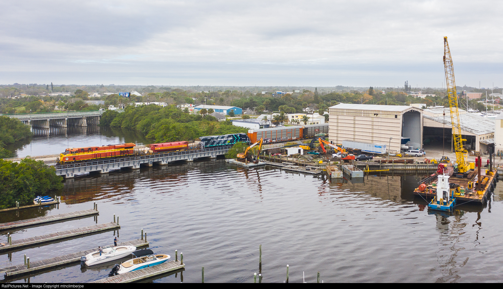 | With a pair of ES44C4's bracketing an LNG tender leading the way, the Florida East Coast's train 101 approaches Fort Pierce, Florida as it heads south. The the train is crossing over the outlet of the Belcher Canal where it joins the intercostal waterway. |