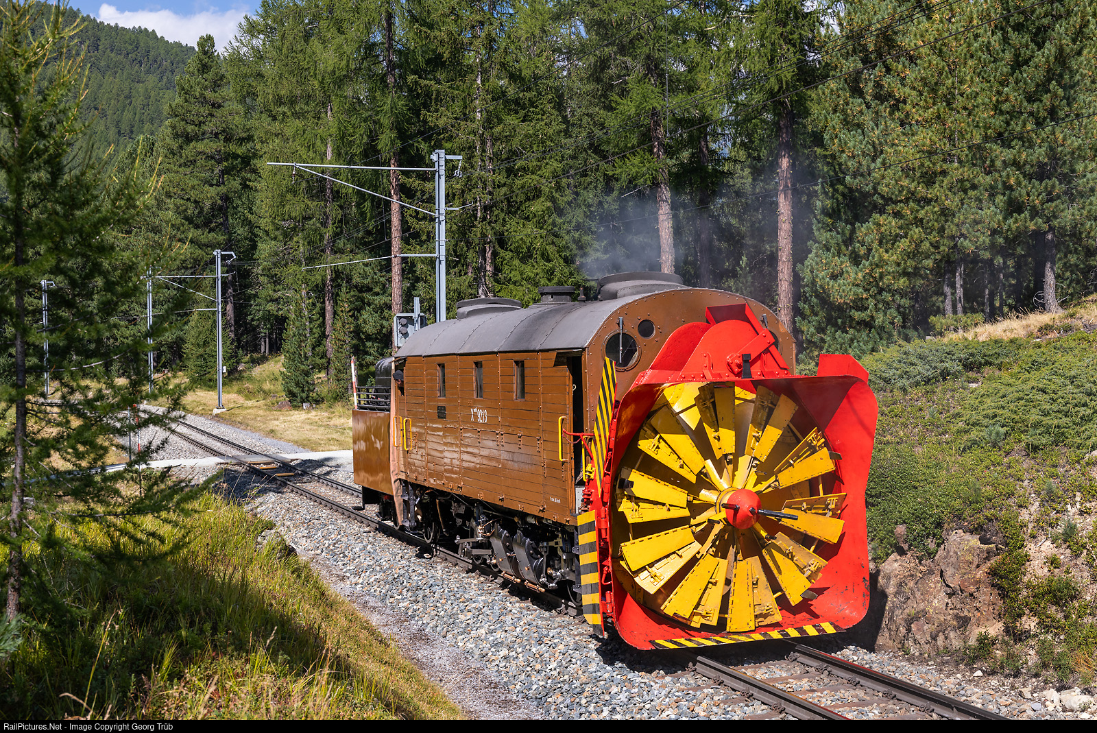 The self-propelled 0-6-0+0-6-0 steam snow blower Xrot d # 9213 of the Rhaetian Railway, built in 1910 by SLM Winterthur as R #1051 for the then independent Bernina Railway, has been preserved as a historic vehicle since 1976. Until 2020, demonstration trips with the impressive machine were carried out in winter in the area of the Bernina Pass at around 2250 meters above sea level. Then a comprehensive overhaul was due. A single employee of the Rhaetian Railway refurbished the Xrot d # 9213 at the Pontresina depot and it is now complete. A load test run over the grade of 7.0 % between Pontresina and Surovas was made, and now the vehicle is returning to Pontresina.