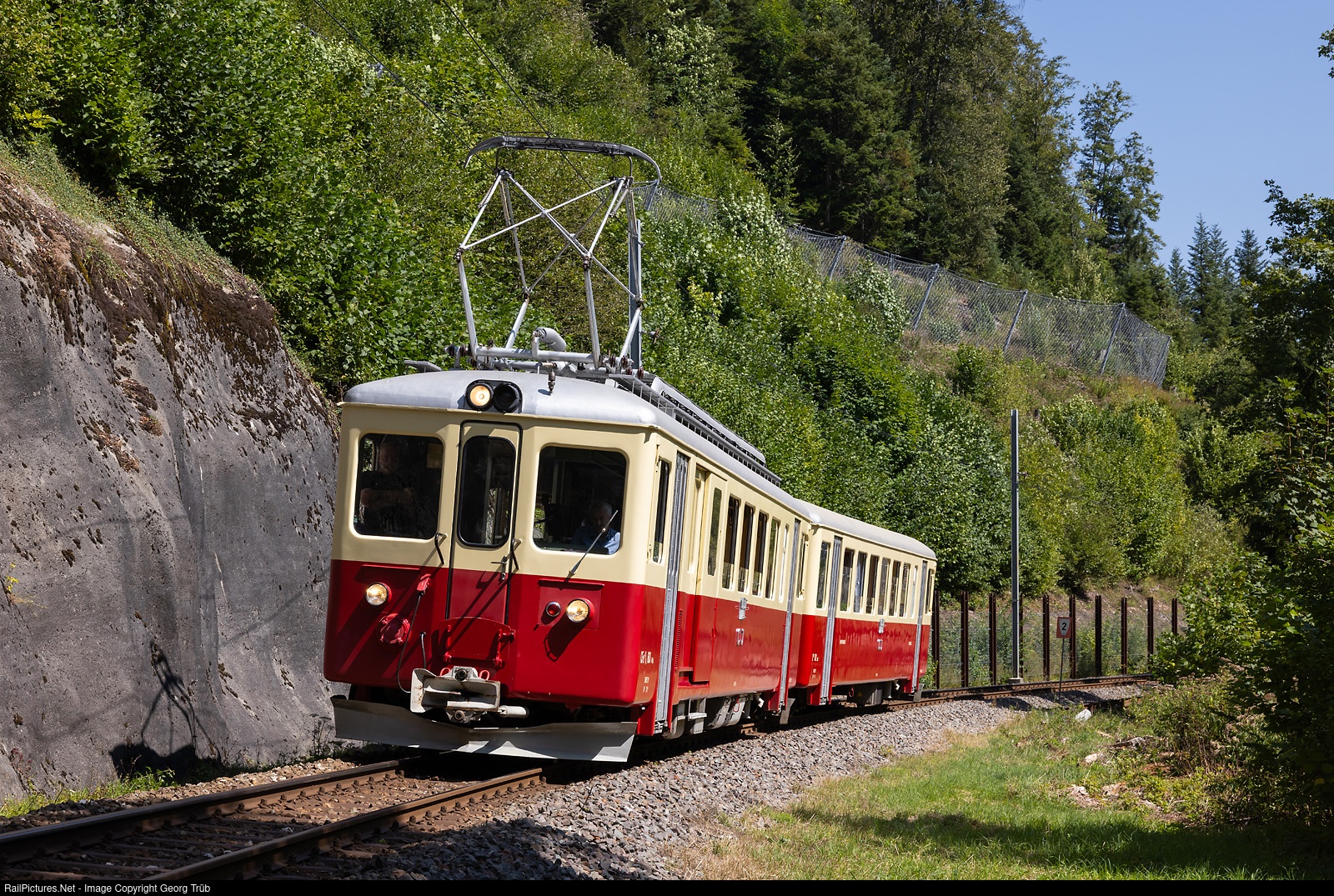 | The “Train des Horlogers” (watchmaker's train) push-pull train of the Chemin de Fer du Jura (CJ), in service with the La Traction association since 2013, on a photo run between Combe-Tabeillon and Bollement. The CFe 4/4 # 601 railcar pulls the Ct # 701 driving trailer built in 1953 by SIG and SAAS for the CJ.