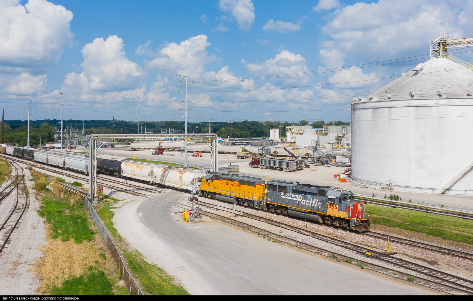 | With a former Southern Pacific GP60 leading the way, Union Pacific's LHM31 local out of Marshalltown arrives in Eddyville, Iowa and proceeds through the Cargill Facility. After pausing just north of here to let the Railserve crews clear up, the local is heading for the yard south of the complex to drop their cars. |