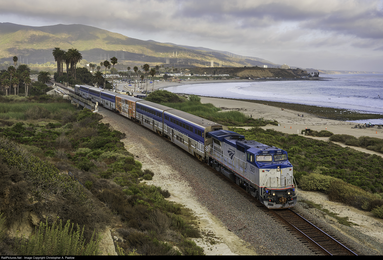 With a plethora of equipment issues plaguing Amtrak's Pacific Surfliner, including multiple cab-cars and engines, SC-44 "Chargers," out of service, the saving grace was with AMTK #503. It's almost impossible to have seen one of these units used on the mainline in SoCal over the last six years, but I guess the saying 'never say never' is still valid today. AMTK 503 had made an appearance a few days prior to this photo on a late evening A591. Lighting conditions did not allow for this shot you see before you. I'd been planning a photo for this location for a while, and with 503 removed from A591 that night I thought all hope was lost. A few short days later it was put back on and was set to lead A587 on the northbound end again. I parked off of Cristianitos Road, about 1.5 miles, which meant a little hike each direction. The location was well worth it. Especially when you watch the surfers between each train that passes. It's also nice to get a shot with the San Onofre Nuclear Power Plant, otherwise known as "The Boobs" for all the locals that pass it. Next time I would just love that perfect sunset, golden hour light instead of the coastal marine layer. You win some, you lose some, and sometimes it's a compromise.