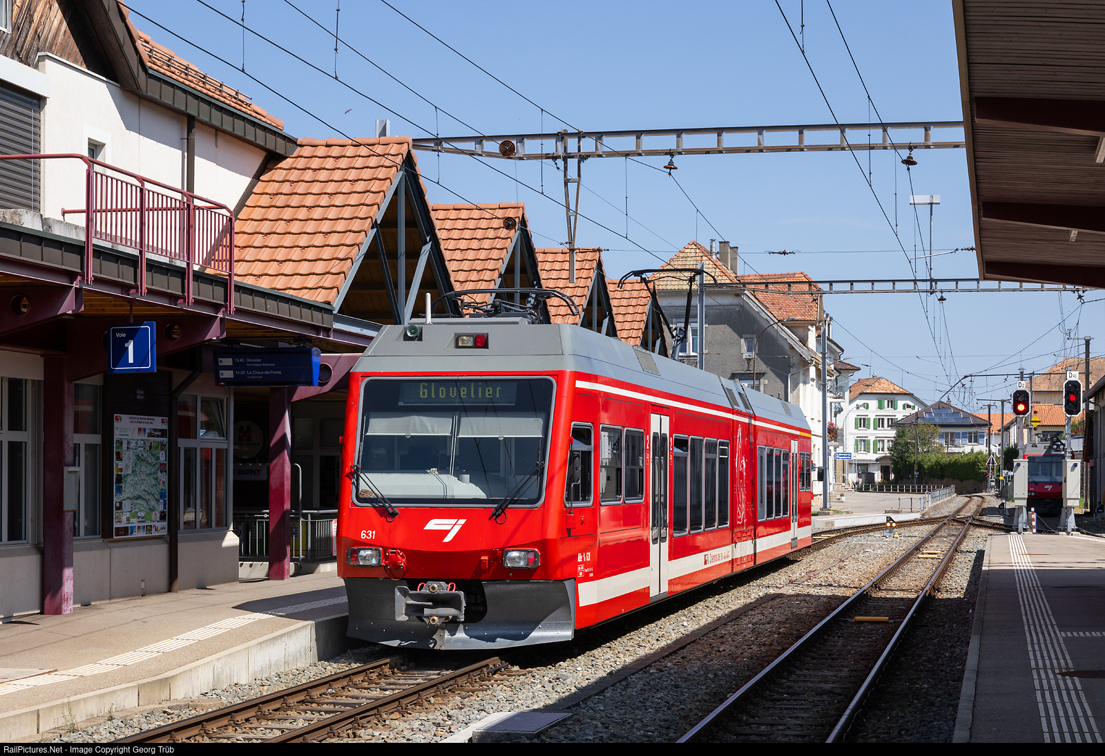 | Articulated lowfloor regional train ABe 2/6 # 631 of the Chemins de fer du Jura (CJ) in Saignelégier, running the regional train 249 of the line R36 from La Chaux-de-Fonds to Glovelier. |