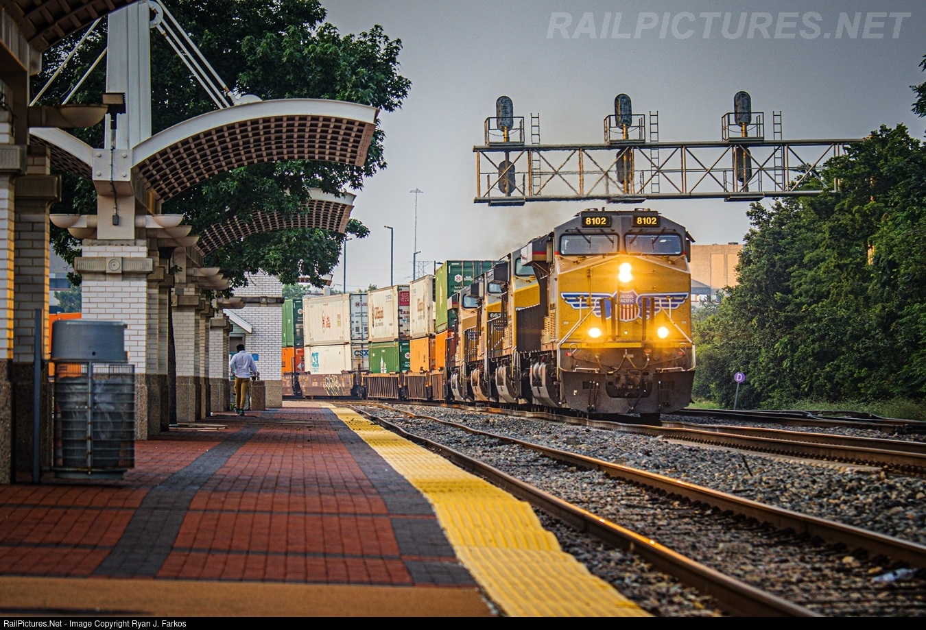 | UP 8102 fresh out of the Mesquite Intermodal Terminal leads ZMQLA along Dallas Sub main 1 as the first bits of sunlight shine down on Eddie Bernice Johnson Union Station |