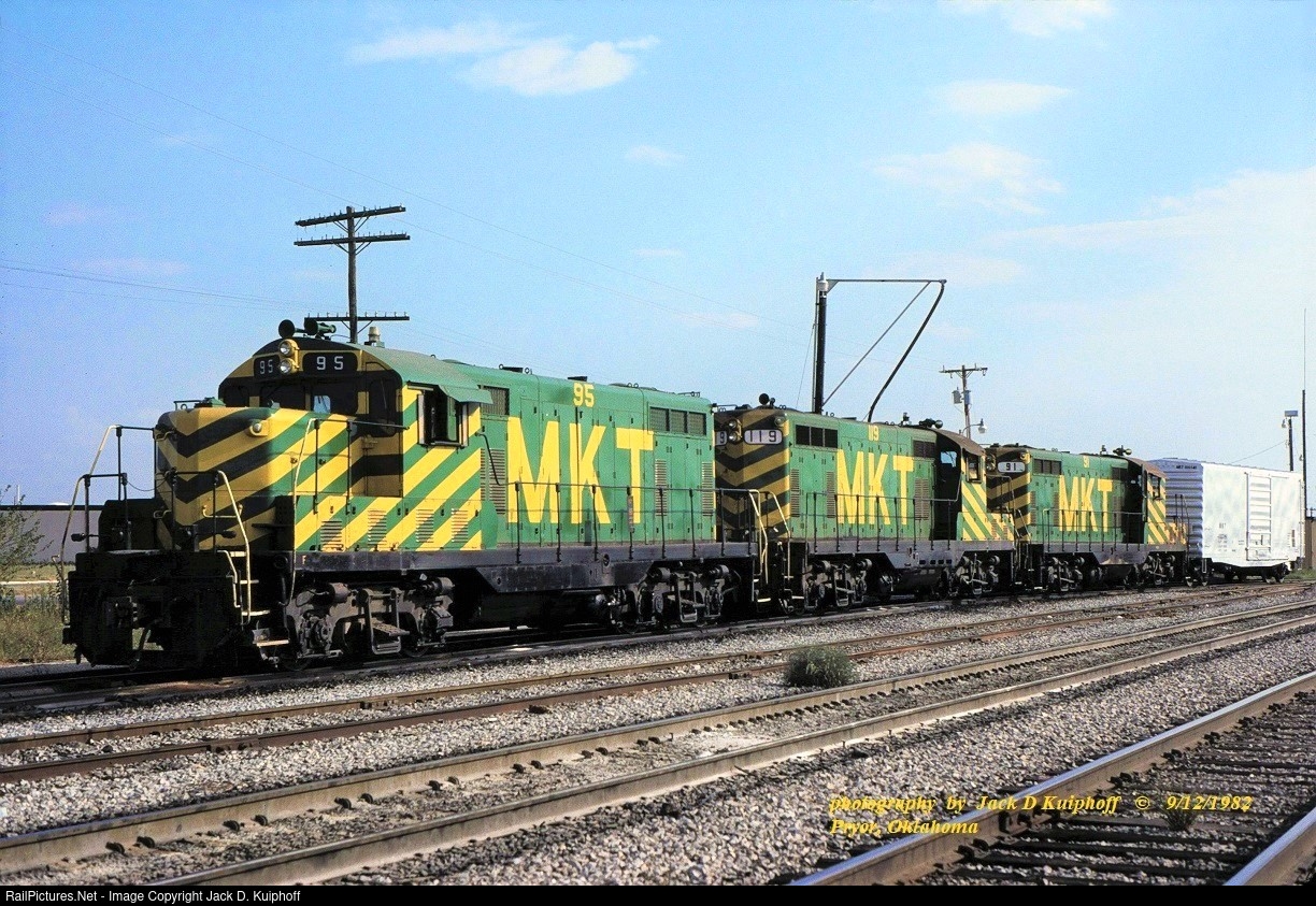 | Missouri Kansas and Texas, MKT GP7's 95 -119 -91, at Pryor, Oklahoma. September 12, 1982. Jack D Kuiphoff © photo |