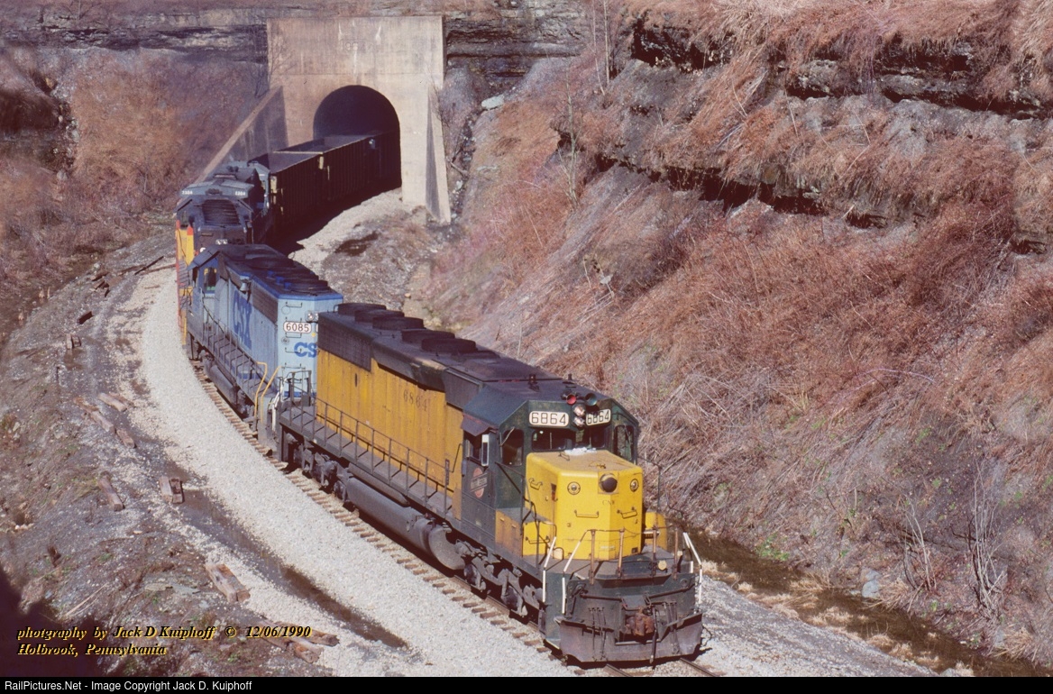 C&NW 6864 CSX 6085 -Chessie 8259 -MGA 2304, with a WEPX train on the MGA's Waynesburg Southern exiting the south end of White Cottage tunnel, Holbrook, Pennsylvania. December 6, 1990. Jack D Kuiphoff photo