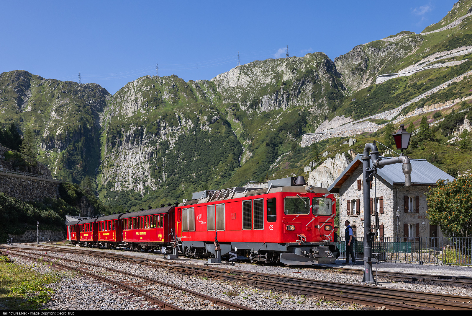 Cogwheel diesellocomotive HGm 4/4 # 62 of the Matterhorn-Gotthard Bahn (MGB), rented by the Dampfbahn Furka Bergstrecke for the season, in Gletsch with a passenger special from Oberwald to Realp. On this day, the loyal donors of the Furka Mountain Railway Foundation were invited to a thank-you event. The major challenges facing the infrastructure in the coming years were demonstrated at various points along the route. There is a need to catch up on bridges, tunnels, slope shoring and, above all, the condition of the rack and pinion track.