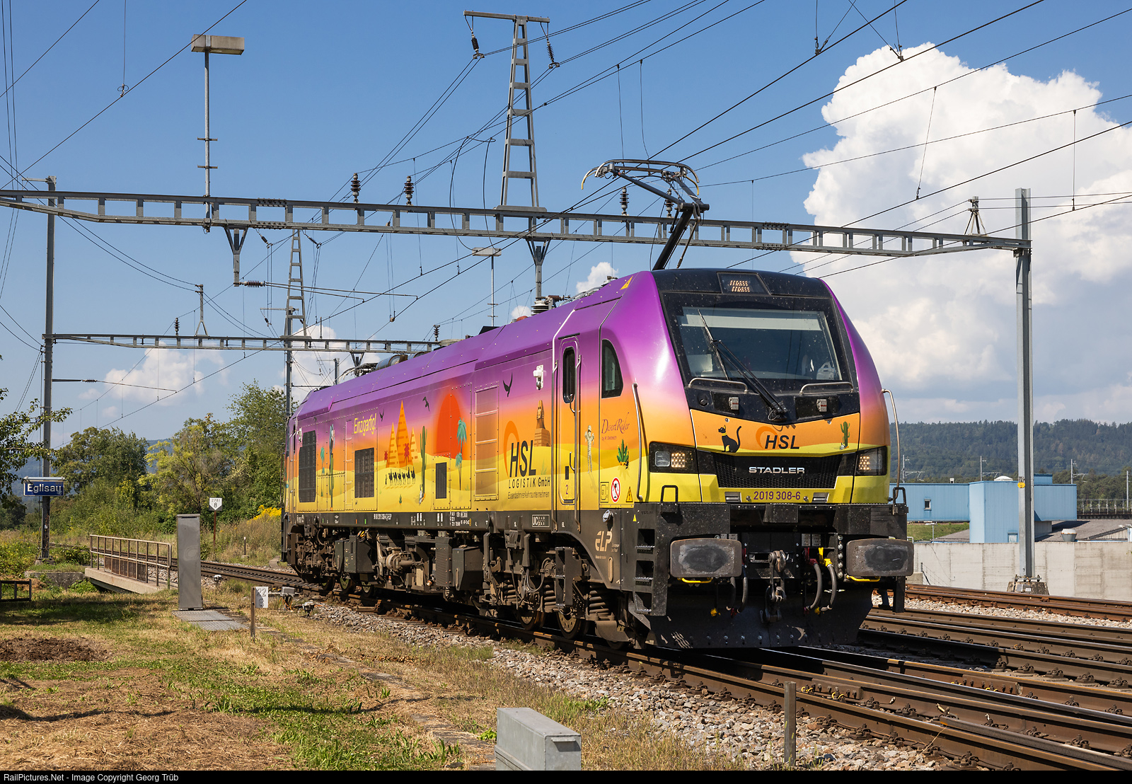 | The new "Euro9000" multisystem locomotive (4 electric systems wih up to 9000 kW and diesel) 2019 # 308 "Desert Rider" of the HSL Logistik, leased from the European Loc Pool (ELP) and built by StadlerRail/Valencia/Spain, is entering Eglisau, running light as 38441 from Basel shunting yard via Laufenburg-Koblenz-Bülach-Winterthur to Islikon. |