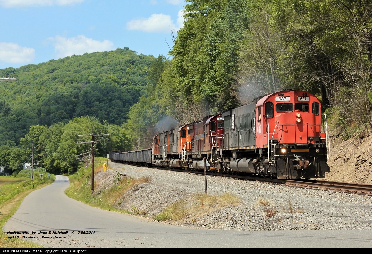 | WNY&P 637, dropping down off the hill from Keating Summit with a southbound DFT on the Buffalo Line at Gardeau, Pennsylvania. July 9, 2011. Jack D Kuiphoff © photo |