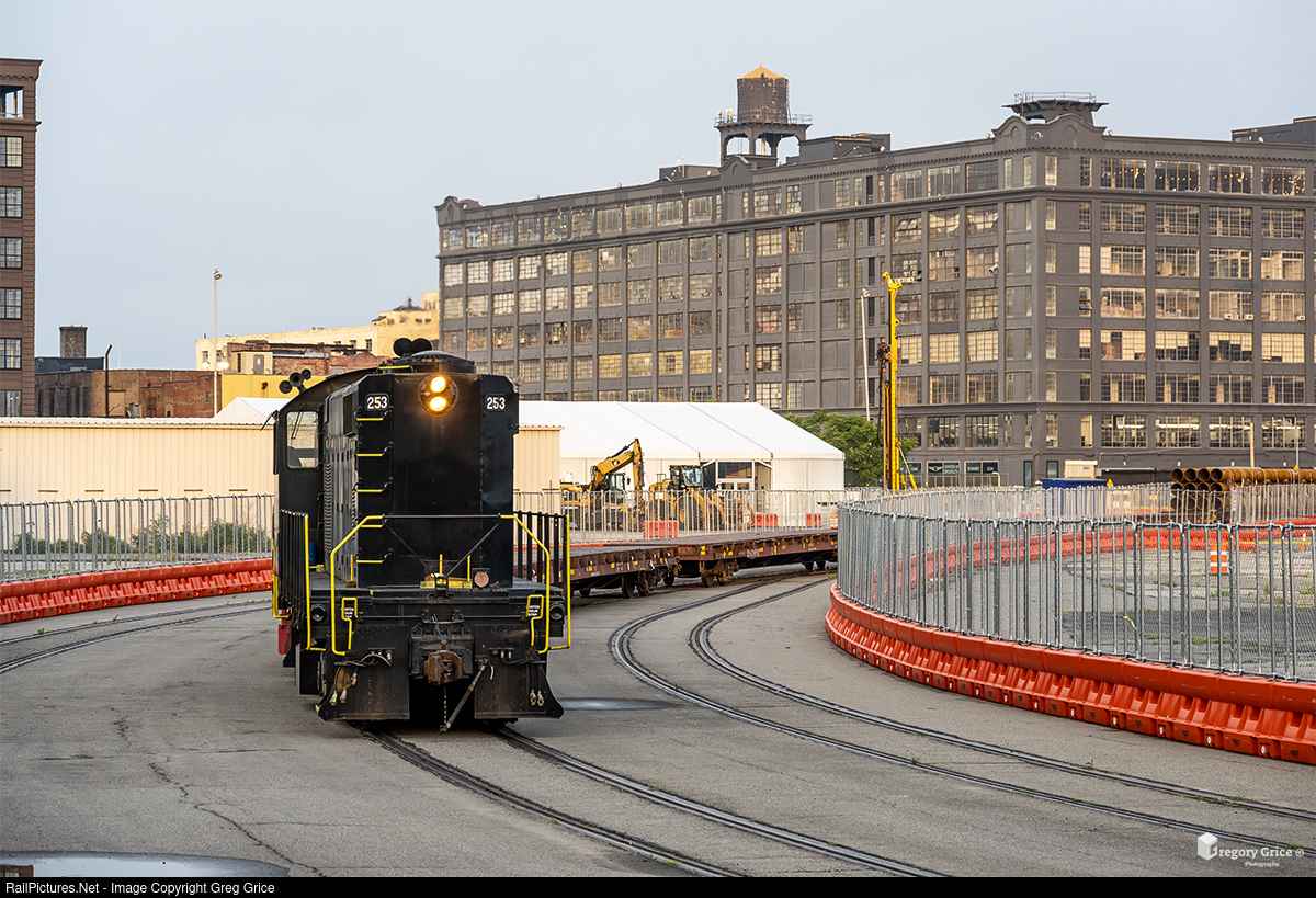 On the morning of July 6th, 2024, New York New Jersey Rail's "Brooklyn crew" tows a cut of flatcars in the South Brooklyn Marine Terminal in Brooklyn, New York. Leading the train is KLWX 253 (Morrison-Knudsen TE-47-4E) and NYNJ 5101 (Knoxville Locomotive Works SE10B).