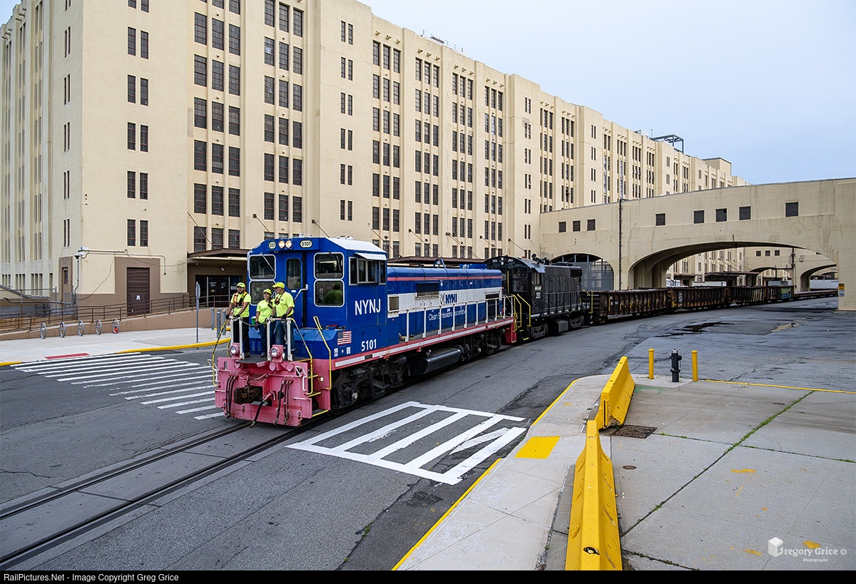 On the morning of July 6th, 2024, New York New Jersey Rail's "Brooklyn crew" heads through the Brooklyn Army Terminal as they approach the entrance to 65th Street Yard in Brooklyn, New York. Leading the train is KLWX 253 (Morrison-Knudsen TE-47-4E) and NYNJ 5101 (Knoxville Locomotive Works SE10B).