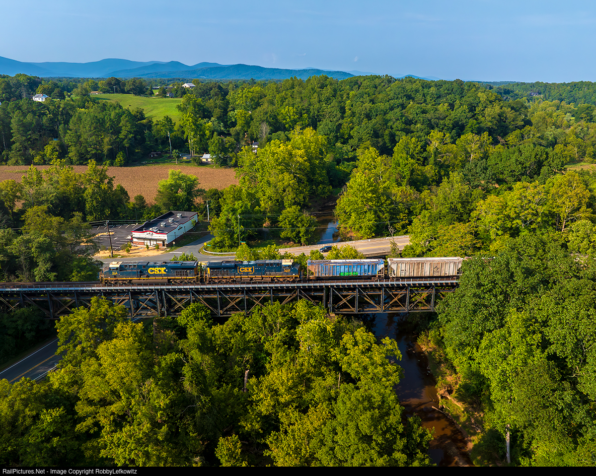 CSXT 813 leads empty grain train CSX G694 westbound through Ivy, Virginia, as they pass over a trestle bridge. |