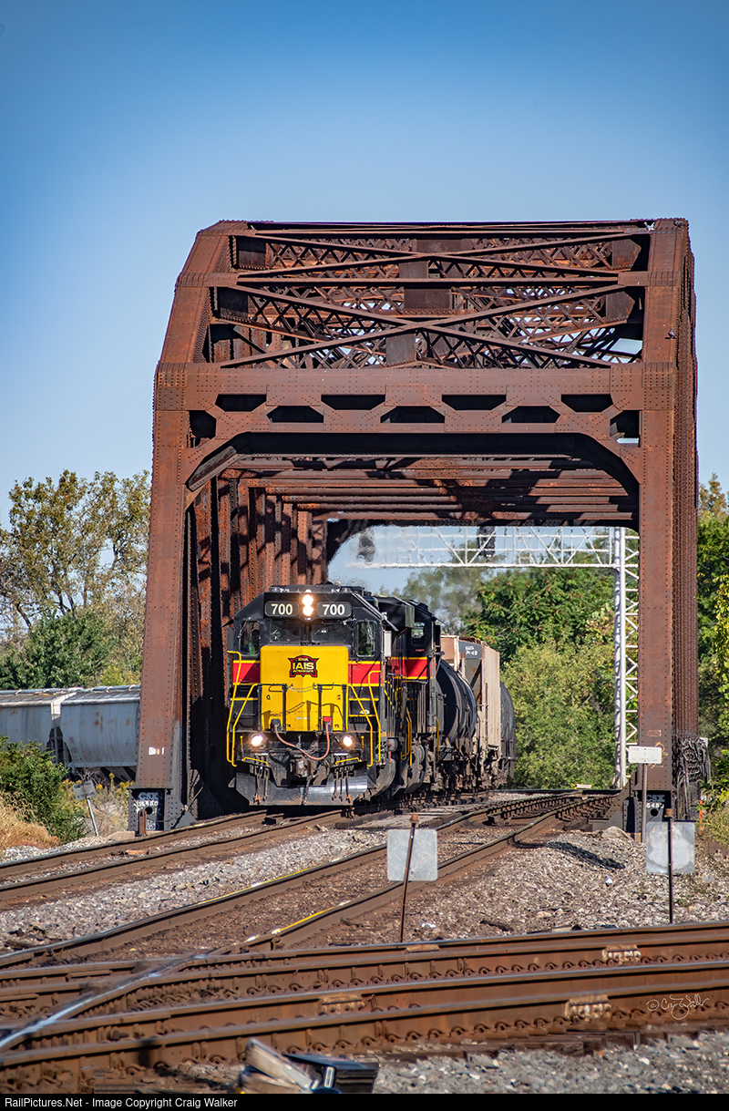 A CSX crew working on the diamonds takes a brief break to allow an Iowa Interstate train, crossing the Calumet Sag Channel on the Baltimore & Ohio Chicago Terminal (also known as the Indiana Harbor Belt/CSX Transportation "Joint Line"), to pass by as it makes its way IHB’s nearby Blue Island Yard. IAIS GP38-2 700 (with a rather lengthy lineage: ex-LLPX 2301, ex-UP 410, ex-UP 1910, ex-EMDX 740, ex-CR 7940, ex-PC 7940; née-EMD 740) and ES44AC 505 (which, having been purchased new, has no heritage at all!) are having no problem pulling this long train on the flat midwestern trackage. (Blue Island, Illinois - September 27, 2021)