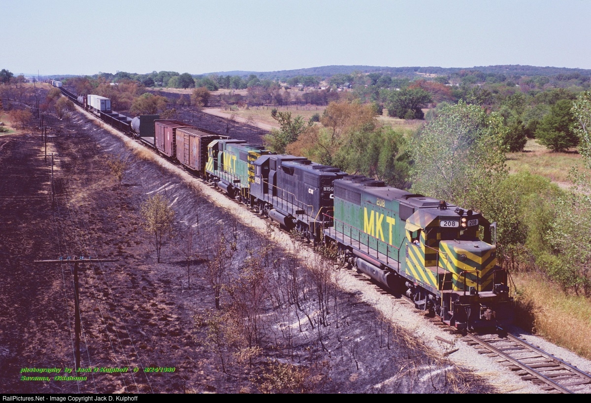 | MKT 208 -Conrail 8153 -MKT 317, with a northbound after a brush fire at Savanna, Oklahoma. August 24, 1980. Jack D Kuiphoff © photo |
