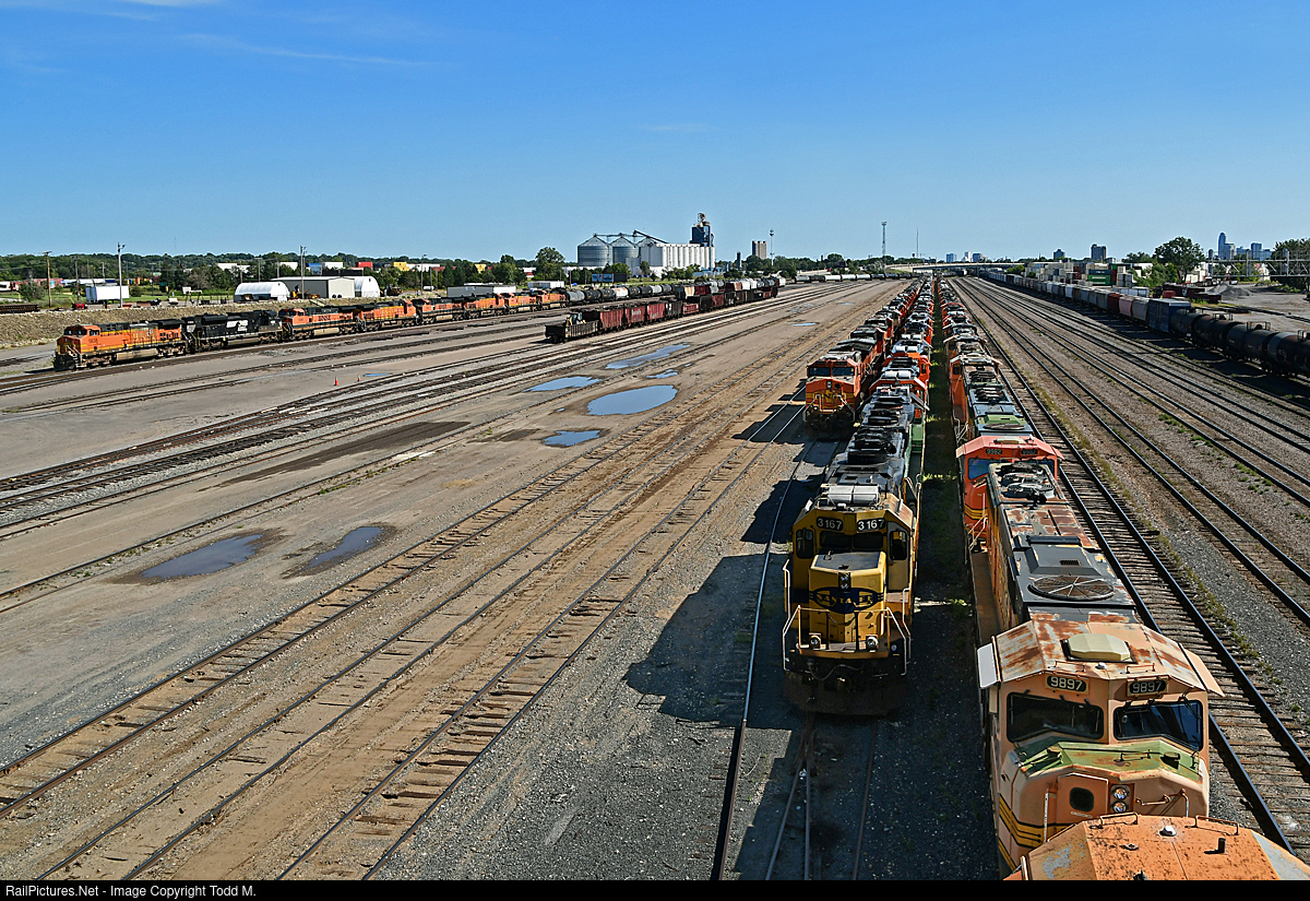 A long manifest with plenty of power hooks along the north side of BNSF's Northtown railyard near downtown Minneapolis, MN on a hot and windy last day of August, 2024.