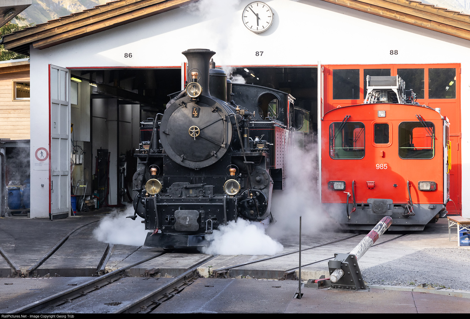 In the evening before 6 PM, the cogwheel steamlocomotive HG 3/4 # 4 is shoving the cold HG 4/4 # 704 into the shed in Realp DFB. On the right is cogwheel diesel vehicle Tmh # 985.