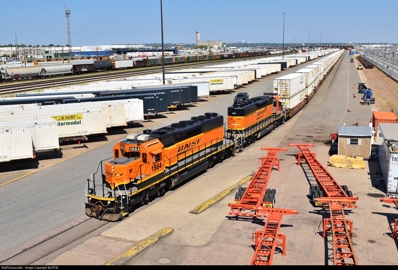 | BNSF 1984 (SD40-2) pulls a string of stack train cars out of the intermodal facility in Denver, Colorado.