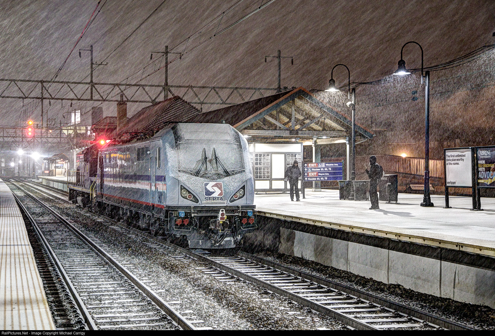 | On a snowy night in Philadelphia, PA, SEPTA's brand new #901 is towed into Wayne Junction station. These new locomotives would soon replace the AEM-7s and ALP 44s becoming the new backbone of the "push-pull" sets. A passenger on the opposite platform took a moment to appreciate the new equipment arriving on the property. |