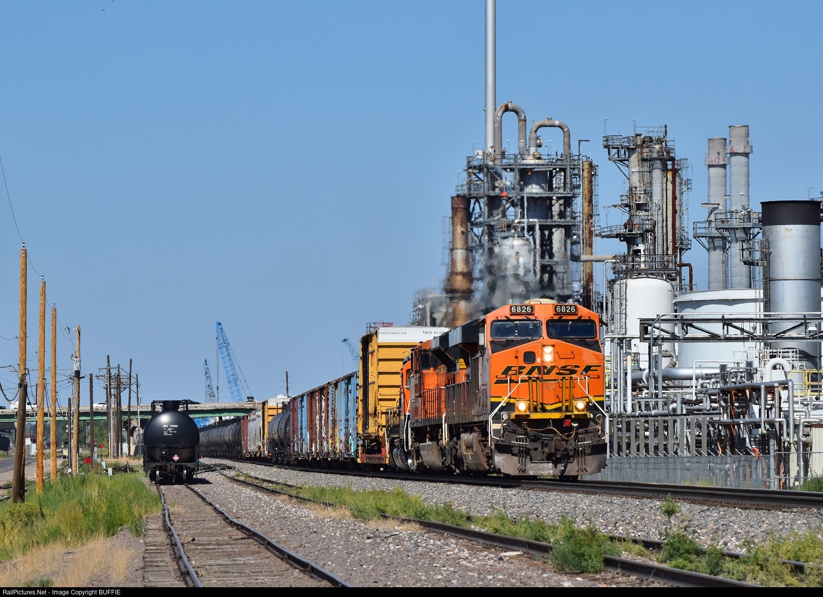 BNSF 6826 (ES44C4) leads a freight past the refineries in Commerce City, Colorado.