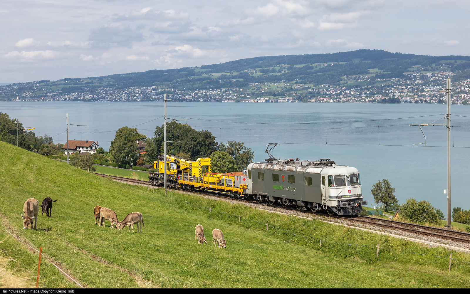 Former SBB prototype locomotive Re 620 # 003 (Re 6/6 # 11603), built in 1972 by SLM, BBC and SAAS, was sold to RailAdventure in august 2018, new designed and got the name of "Suisse Svizzera" instead of "Wädenswil". This day she pulled train 69153 of TR TransRail from Brugg AG via Zürich Altstetten-Wädenswil-Samstagern to Einsiedeln, between Wädenswil and Burghalden with the Lake Zürich in the background. The load is the 8 axle Kirow Multi Tasker KRC 800 ZW railway crane and the trailer car.