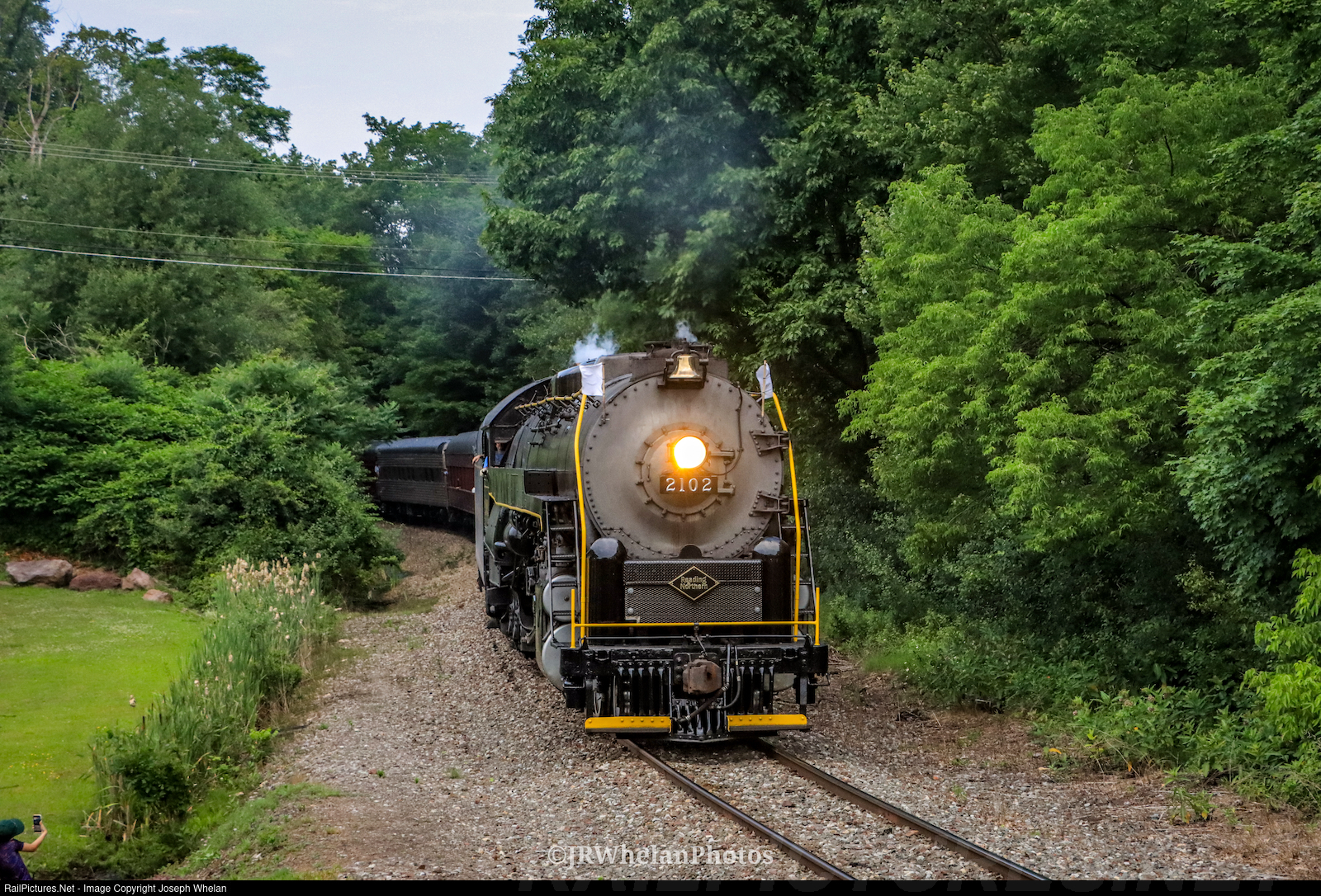 | Reading 2102 rushes downhill past the library at White Haven, during the first ever Iron Horse Ramble on the Lehigh Division. |