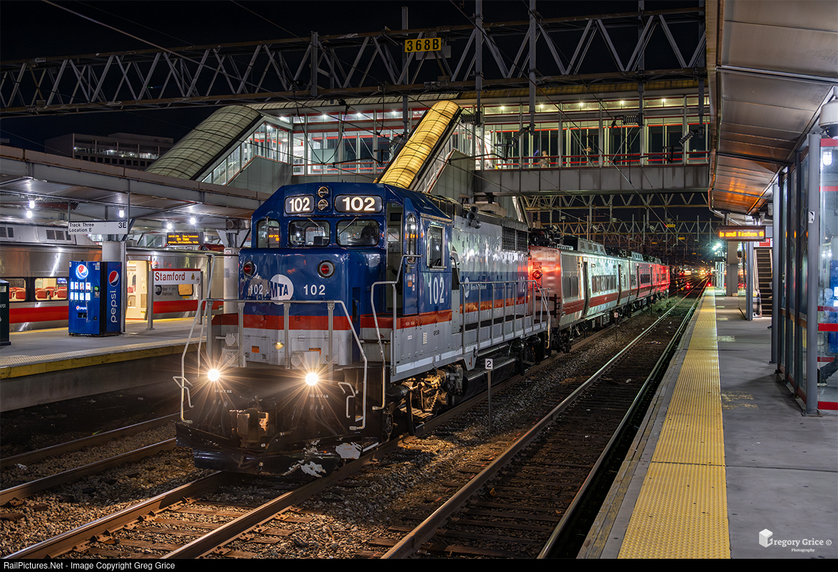 During the late night of July 16th, 2024, Metro-North Extra 102, led by EMD GP35r 102, arrives at Stamford Station on the New Haven Line, shuttling three Kawasaki M8 'S' railcars back to Stamford Yard after receiving wheel work at the New Haven Yard Wheel Mill.