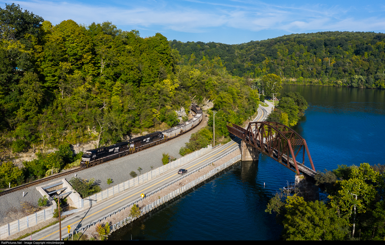 | Norfolk Southern mine run N23 rounds the bend in Millsboro, Pennsylvania as it turns away from the Monongahela River to follow the South Fork Tenmile Creek as it heads towards the Bailey Mile for loading. The abandoned bridge on the right that crosses the river was once the Monongahela Railway's Nemacolin Branch that continued south. |