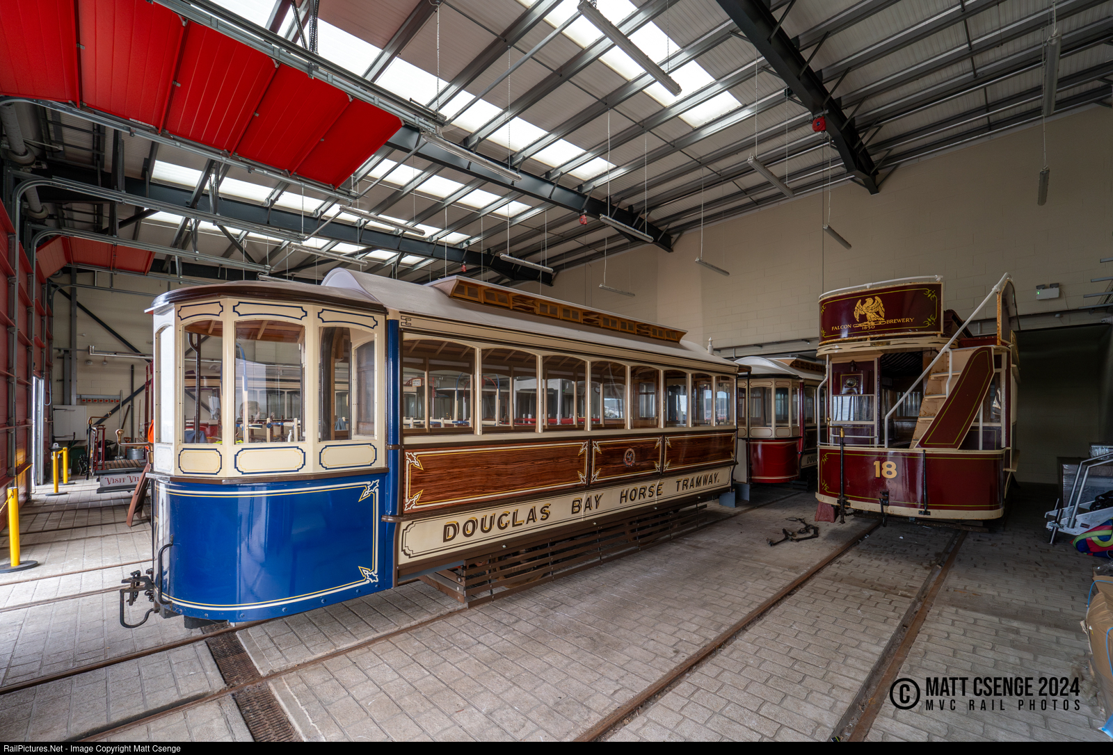 Douglas Bay Horse Tramway double-decker car 18 and enclosed saloon 27 are seen inside the depot at Derby Castle. Car 18 is the oldest on the tramway's roster, having been built by the Metropolitan Carriage & Wagon Co. in 1883.