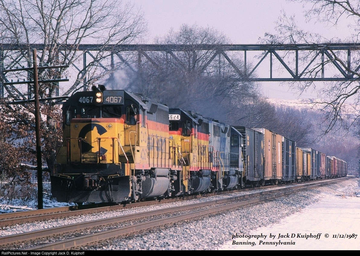 Chessie, C&O GP40 4067 leads eastbound R396 on the ex-B&O Keystone sub. The train passes under the ex-P&WV trestle over the Youghiogheny River at, Banning, Pennsylvania. November 11, 1987. Jack D Kuiphoff © photo