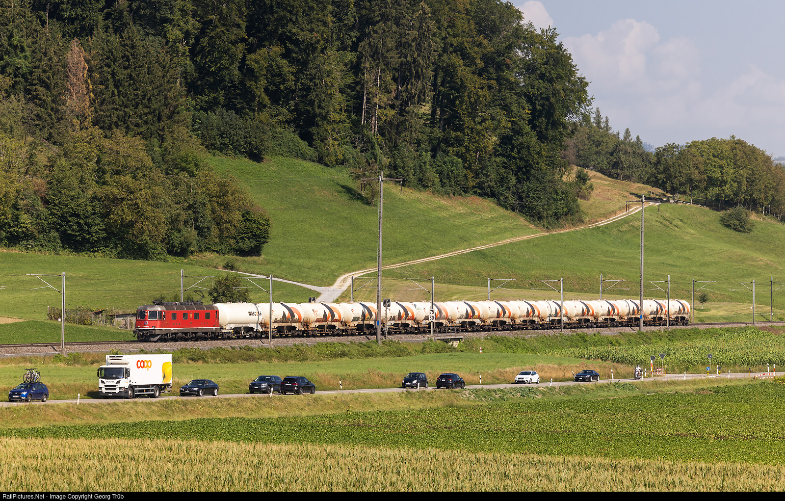 | Re 620 # 080 (Re 6/6 # 11680) of the SBB pulls the HOLCIM oil shale train 47043 from (Dotternhausen-) Singen (Hohentwiel) via Schaffhausen-Bülach-Regensdorf-Brugg-Olten-Biel-Lausanne shunting yard (loop) to Eclepens (ciment work), between Eglisau and Glattfelden. |