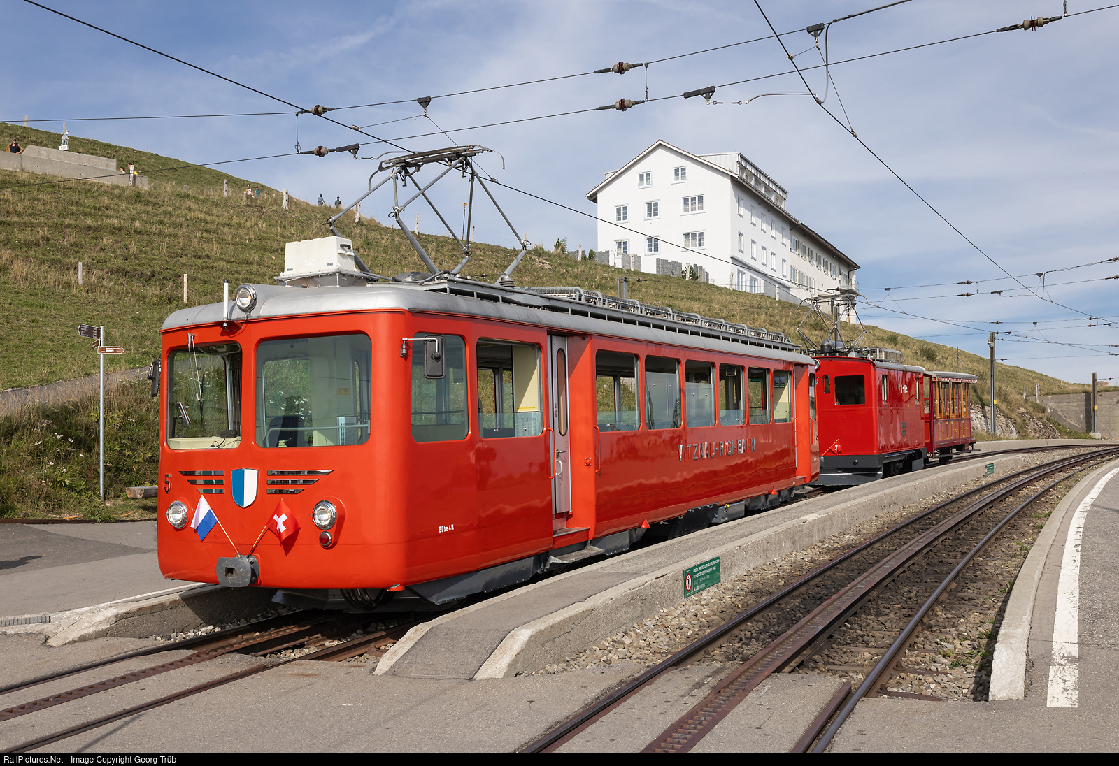 752 kW cogwheel railcar BDhe 4/4 # 5 of the Rigibahnen, built in 1965 by SLM, SIG and BBC for the Vitznau-Rigi-Bahn, on Rigi Kulm. In the background locomotive He 2/2 # 18 with car B # 5. The two trains brought patrons of the Rigi Historic foundation from Vitznau to the top of the mountain.