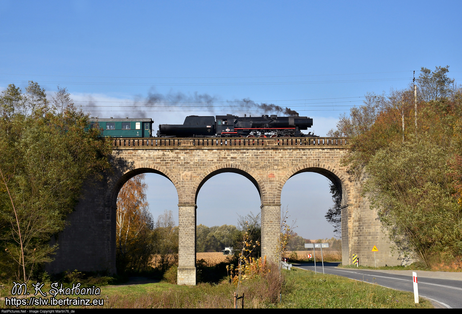 A railway bridge from 1874 over the Budzowka River and the road in Kamieniec Zabkowicki. A special train from Usti nad Orlici in the Czech Republic to Jaworzyna Slaska in Poland, pulled by steam locomotive 555.0153, passes over the viaduct.