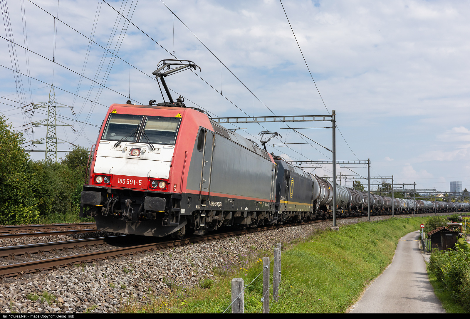 | Bombardier TRAXX F140 AC2 185 # 591 and # 567 of the Beacon Rail Leasing in multiple control, leased to the LTE, pull the loaded tank car train 69600 from St.Margrethen via Romanshorn VL-Winterthur-Kloten-Regensdorf-Brugg-Lupfig to Mellingen. First locomotive was added in Rorschach freight yard. |