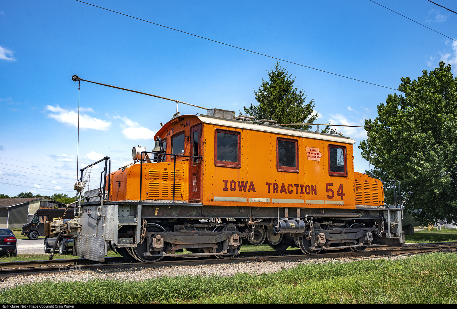 Iowa Traction Railway Company electric-powered 50-Ton Steeplecab locomotive 54, built in 1923 by General Electric; has just arrived and the crew has pulled down it trolley pole. IATR 54 was originally owned by Southern Iowa Railway. (Mason City, Iowa – July 19, 2024)
