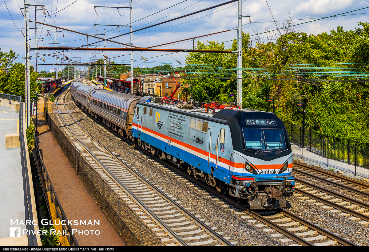 Amtrak Phase III At Elizabeth. The surprise announcement of the Amtrak collaboration with Dovetail Games/Train Sim World 2 that resulted in Amtrak ACS-64 662 being "wrapped" in Phase III in December of 2021 was a wonderful addition to the 50th Anniversary program. The last run that AMTK 662 would make with this wrap was on Sunday, September 4, 2022 leading Amtrak Train 19 (Crescent) seen here about to lean into the curve at Elizabeth, New Jersey as it heads towards Washington D.C., where it will be replaced with diesel power for the train to continue on to New Orleans, Louisiana.