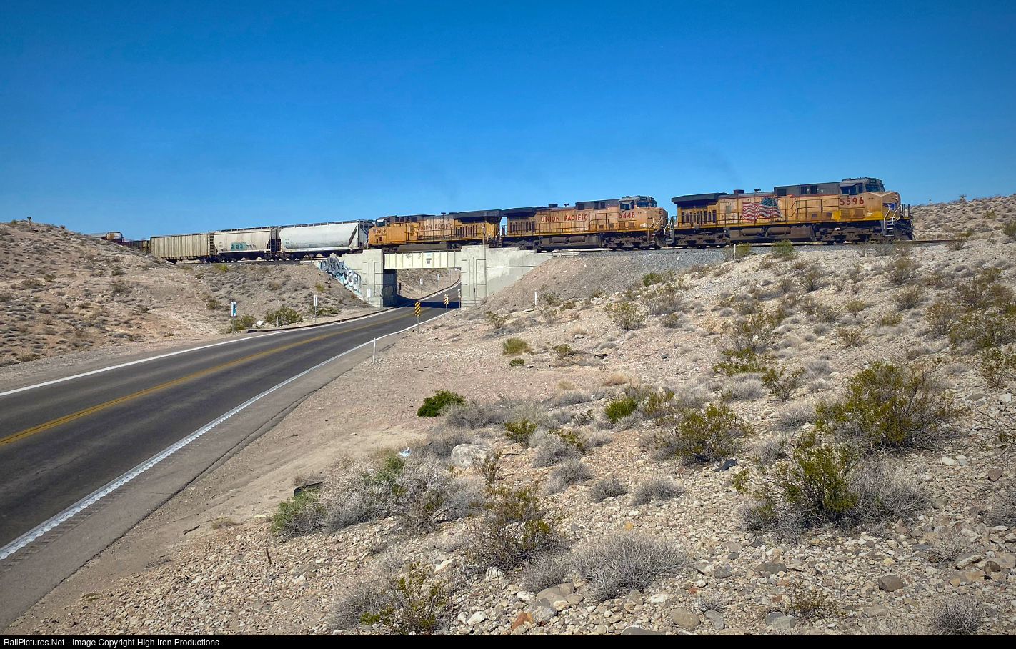 | An eastbound manifest heads towards Las Vegas, having just crossed the border from California into Nevada. This location is just about where the final spike was driven as crews from the east met crews from the west to complete the Los Angeles to Salt Lake line that was responsible for Las Vegas's creation on January 30th 1909. A historical marker stands nearby. |