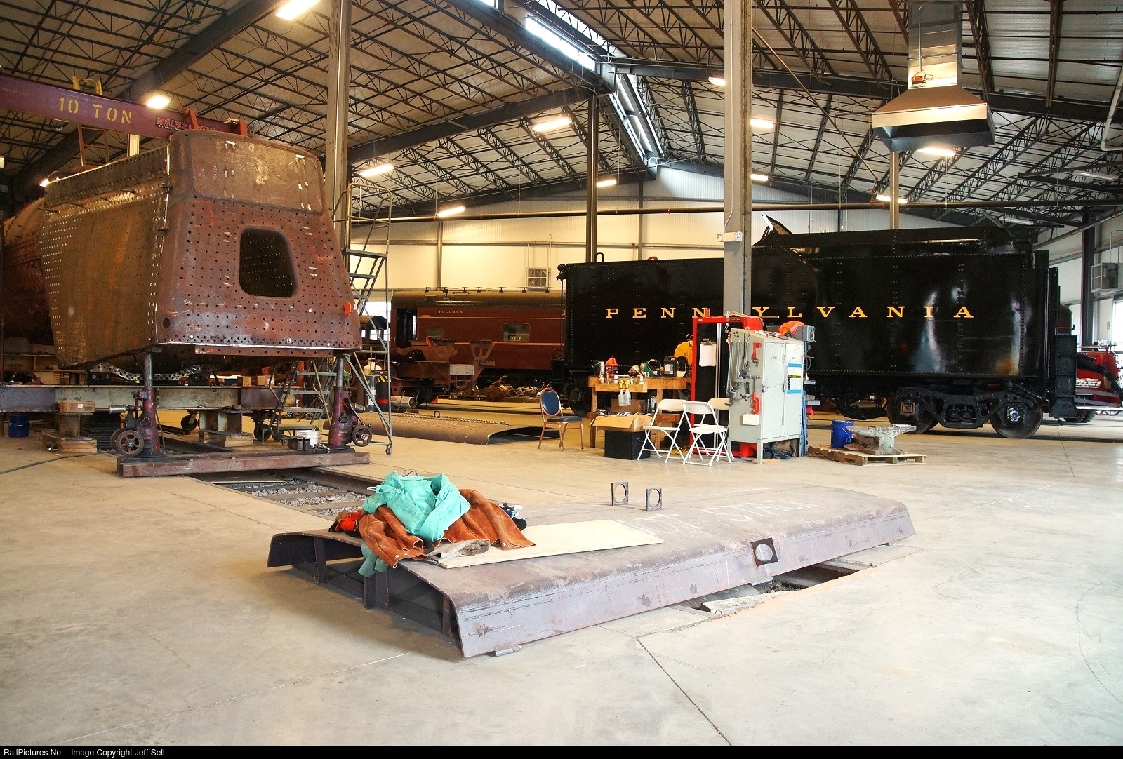 K4s 1361 and her tender sit in the roundhouse of the Altoona Railroader's Memorial Museum. The locomotive is in the process of restoration to operating condition and the tender appears to be just about ready to go. Currently, the sides and rear portion of the Belpaire firebox have been fabricated and added to the engine. The Belpaire top inner and outer pieces of the firebox sit on the floor in the foreground and towards the middle of the photo.