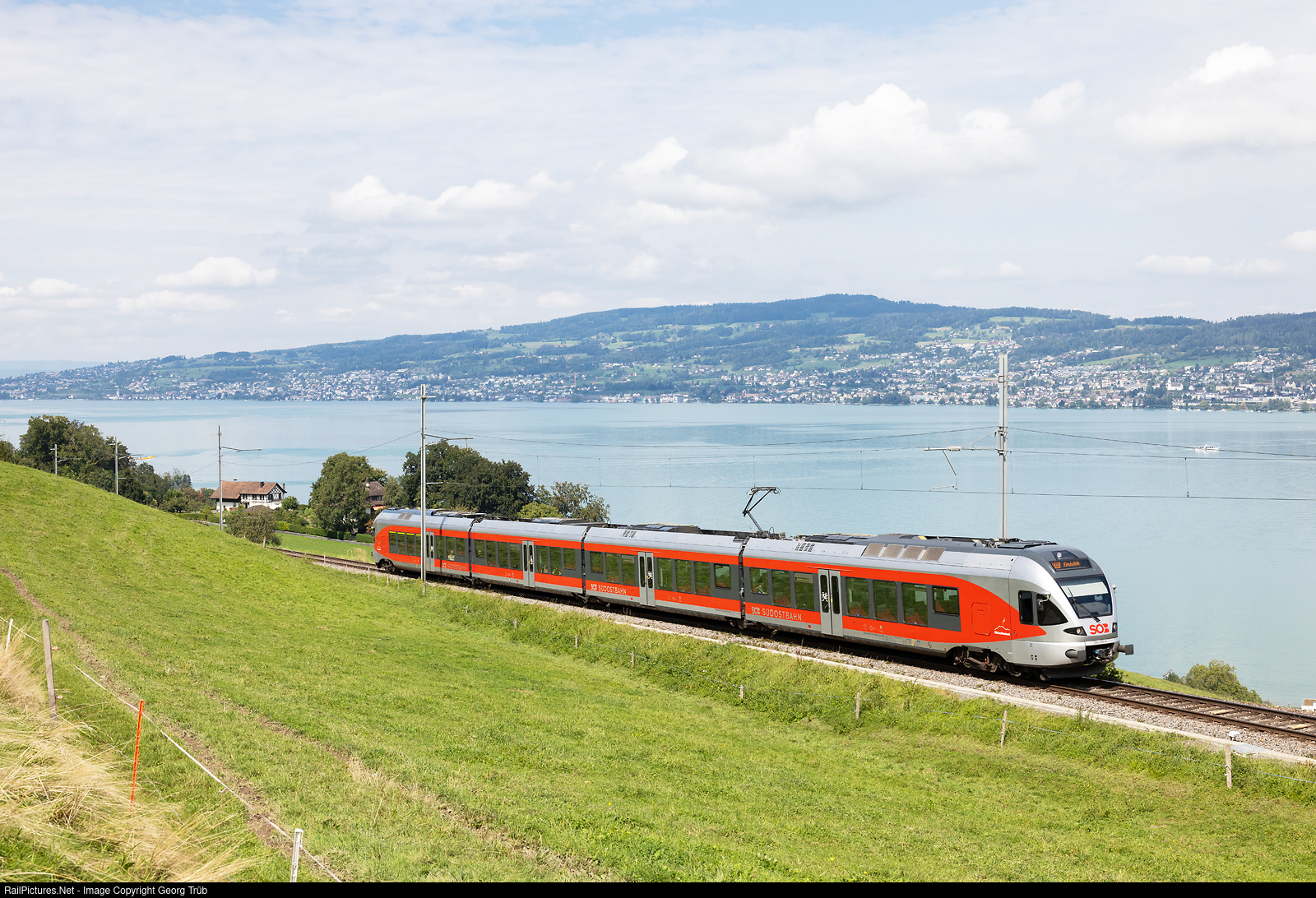 | "Flirt" RABe 526 # 055 of the Südostbahn (SOB) is running the S13 service 19350 from Wädenswil to Einsiedeln, below Burghalden, with Lake Zürich in the background. The line has a grade of 5.0 %. |