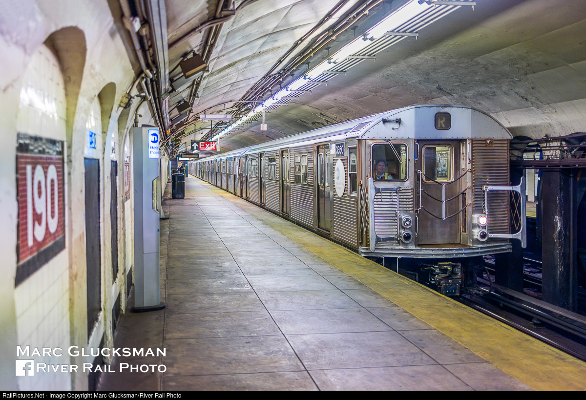 The First R-32. After being sidelined with mechanical issues for more than a decade, MTA NYCT Subway R-32s 3350 and 3351 (1964, Budd) were brought to the shop for repair. These cars were the first of the 600 car order of stainless steel “Brightliners” that was a revolution in the construction of NYC subway cars, and they will be a part of the New York Transit Museum’s “Celebrating 60 Years Of Brightliners” event on Saturday, September 14, 2024. After 58 years of service, the R-32s were retired in 2022 with a series of “Farewell” trips. On the evening of Thursday, September 5, 2024, they are seen passing through the 190 Street Station (A Line), leading a 10-car train of R-32s during an equipment transfer move.