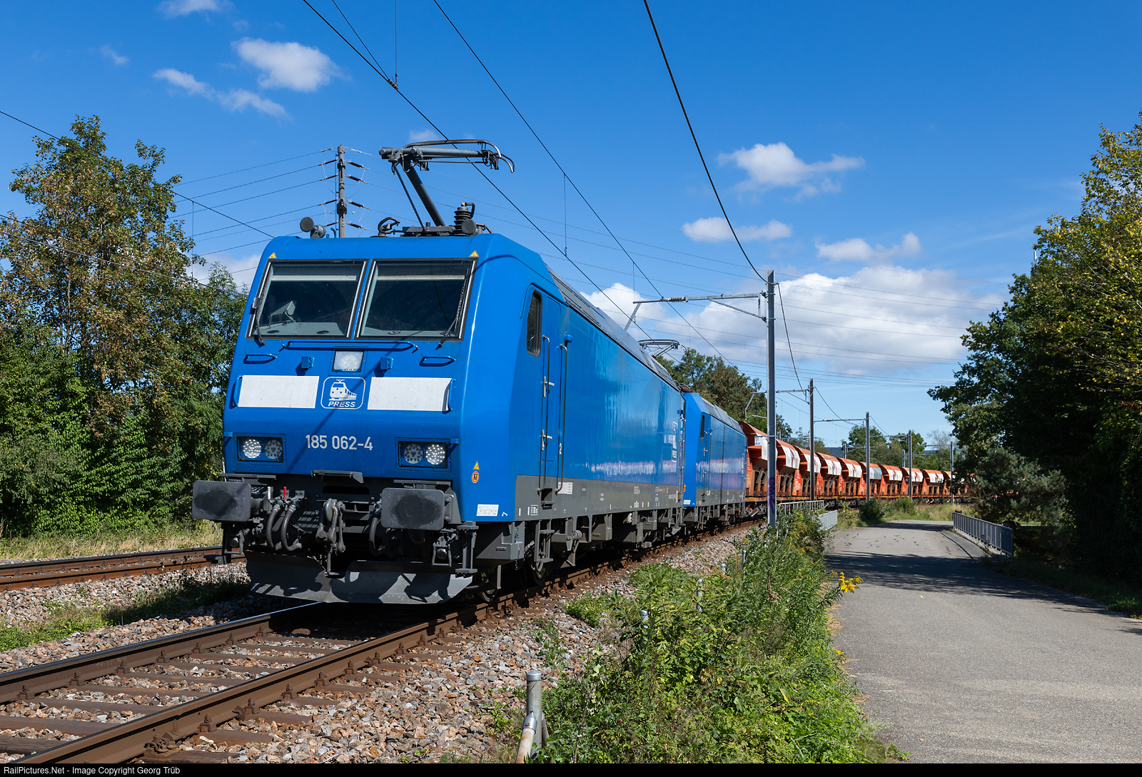 Bombardier TRAXX F140 AC1 185 # 062 and # 061 of the PRESS (Pressnitztalbahn) in multiple control, rented by SBB Cargo, pull the empty HOLCIM gravel train 67554 from St.Gallen Haggen via Romanshorn VL-Winterthur-Bülach to Hüntwangen-Wil, between Müllheim-Wigoltingen and Hüttlingen-Mettendorf, just before the bridge over the Thur. The background: SBB has ordered a total of 35 Vectron locomotives from Siemens for national transport, which should have been delivered from spring 2024. The locomotives cannot yet be used in Switzerland due to the lack of approval for the ECTS Baseline 3 from Siemens. Some of the Re 4/4 II and Re 6/6 locomotives were not overhauled as they were due to be replaced by the new locomotives. As a result, there is currently a shortage of operational freight locomotives.