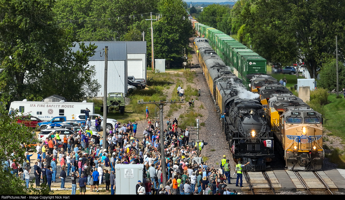 | UP 4014 makes a service stop in Grand Mound, IA as many admirers take the opportunity to get a more up close and personal look at the Big Boy. A passing stack train adds to the already chaotic scene. |