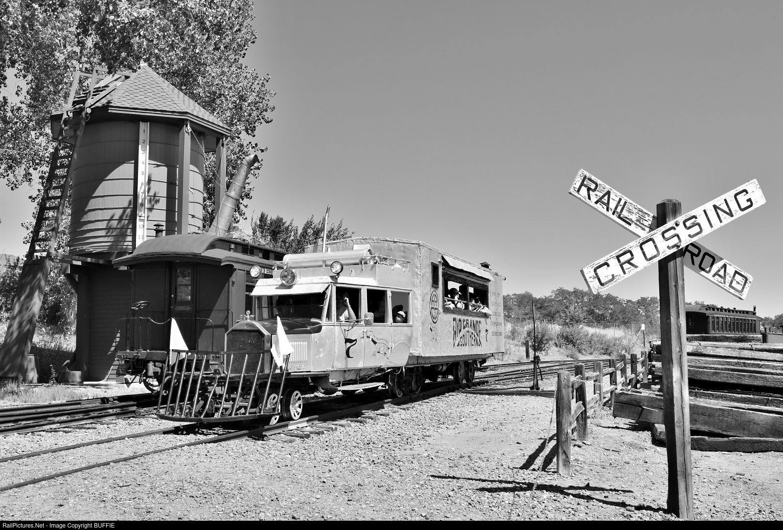 Rio Grande Southern #7 Galloping Goose runs past a functional water tower at the Colorado Railroad Museum in Golden, Colorado.
