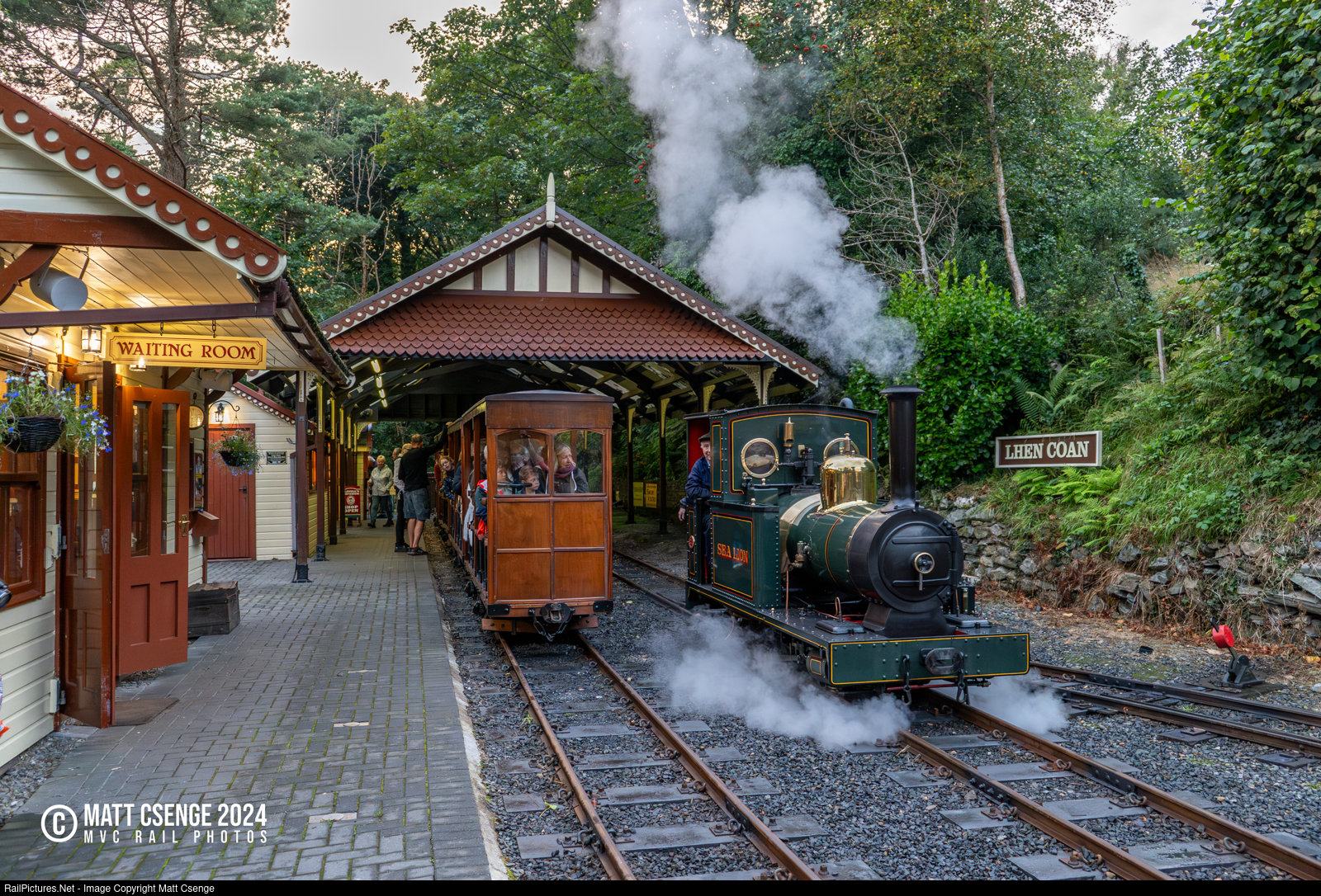 Groudle Glen Railway 2-4-0T steam locomotive "Sea Lion" running around the train at Lhen Coan Station.
