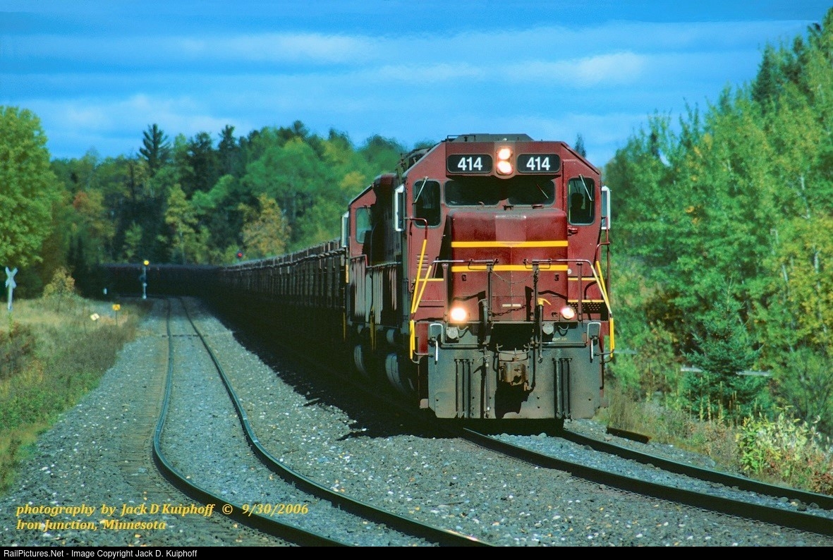 | With a short brake in the clouds, we catch Duluth Missabe and Iron Range, DM&IR SD40-3 414 - 412, with a load of taconite heading to Two Harbors docks about to enter Iron Juction, Minnesota. September 30, 2006. Jack D Kuiphoff © photo |