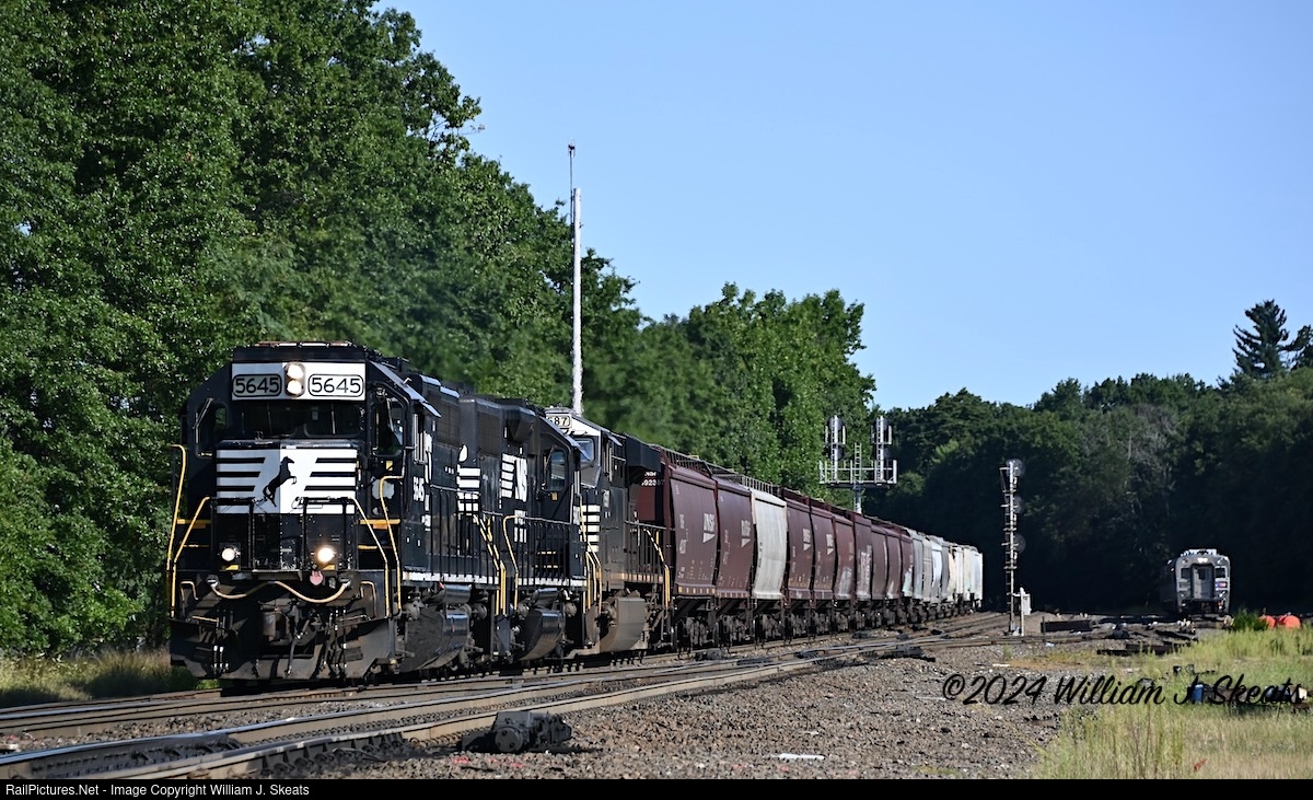 | NS GP38-2's 5645, 5607 and ES44DC 7587 with 19 hoppers heading through WC Interlocking. Headed for Bay State Milling in Paterson, NJ. |