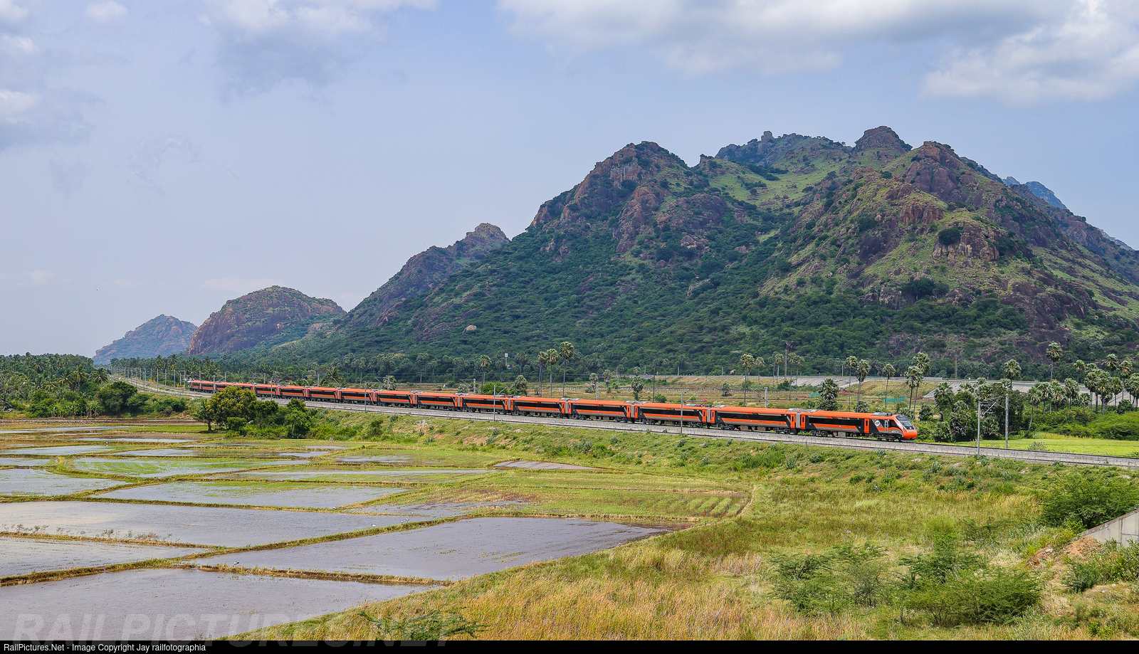 Nagercoil Jn bound Vande Bharat Express passing through the beautiful landscape of Thovalai with Western Ghats in background